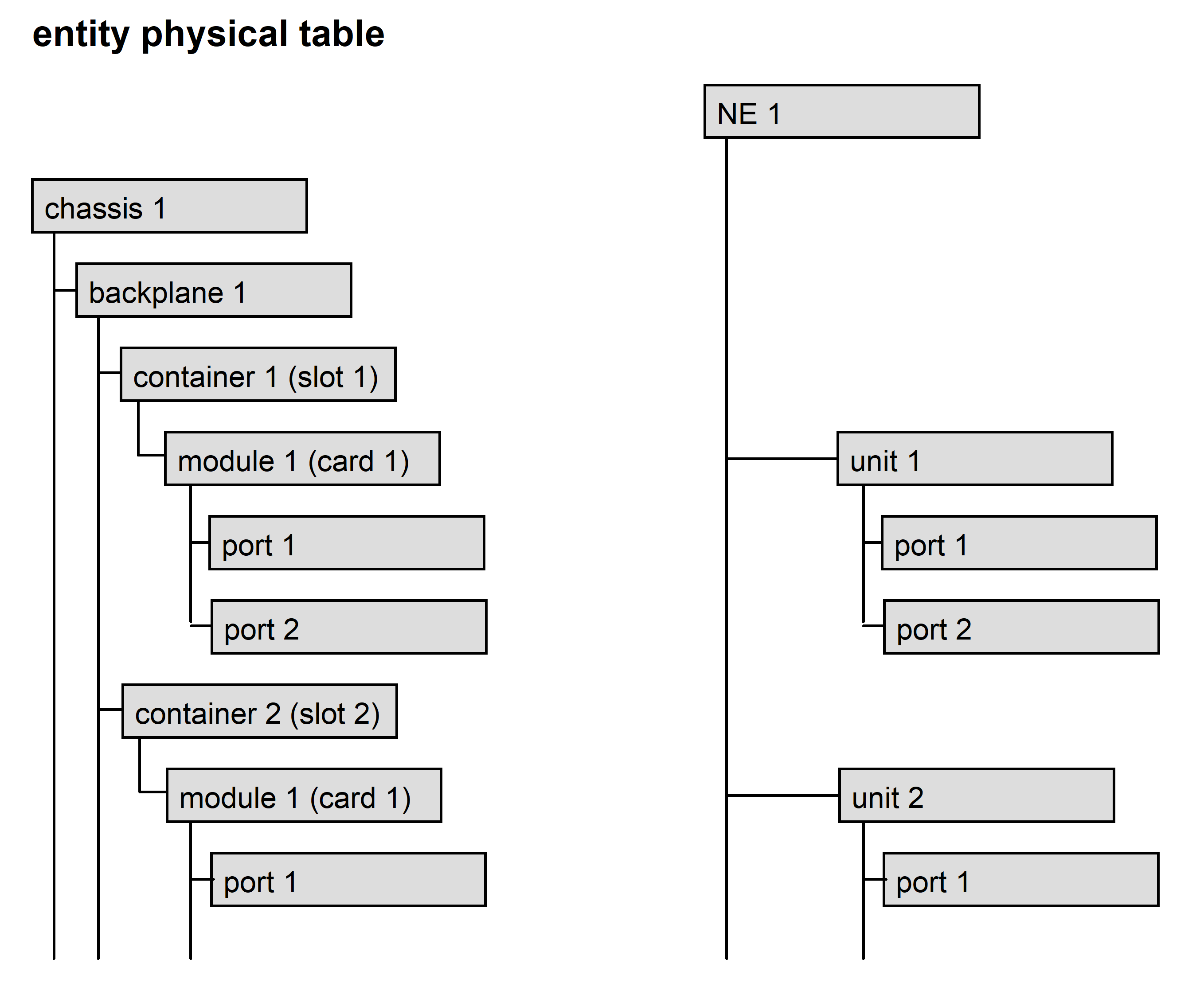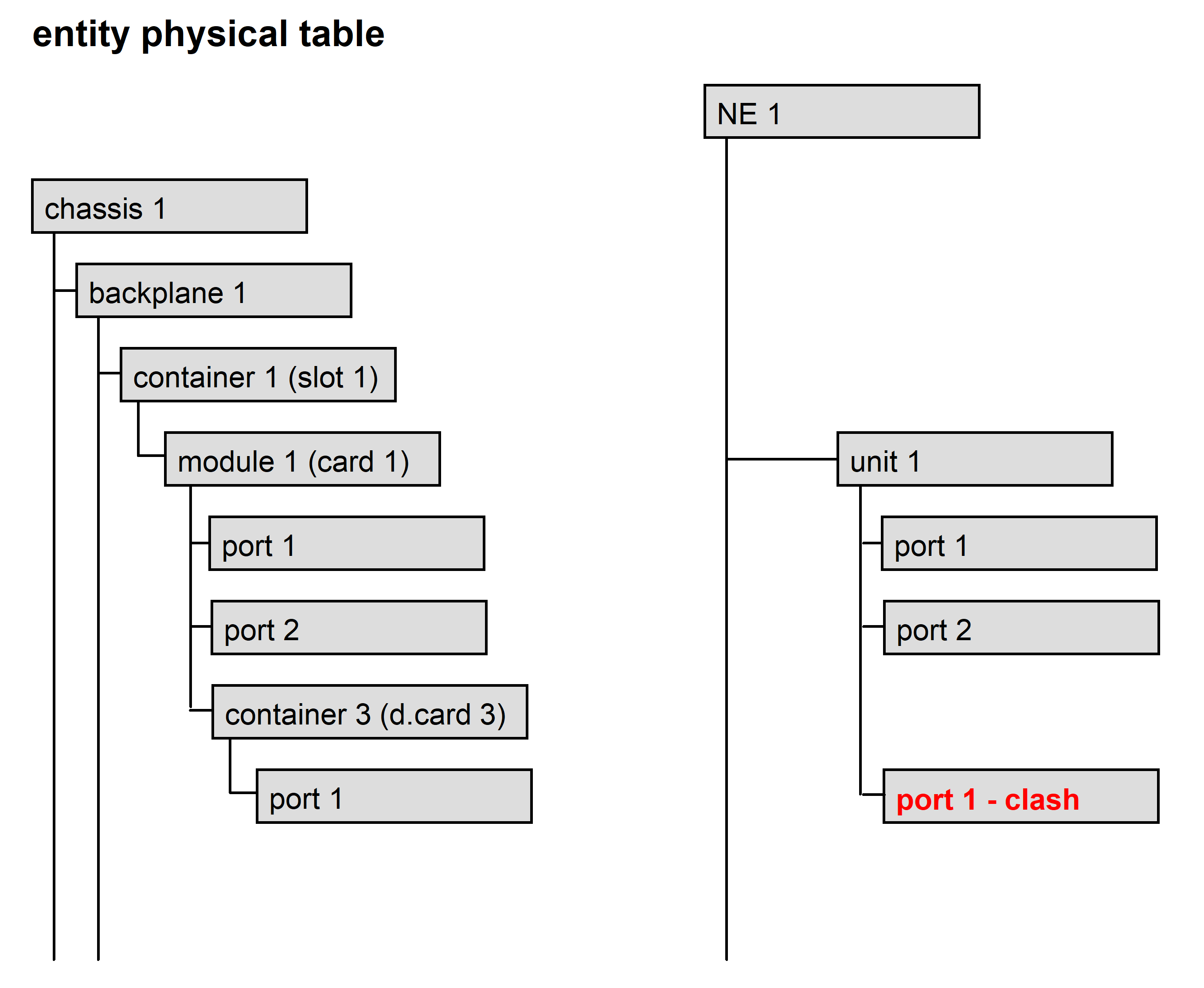Only the entity physical table (.1.3.6.1.2.1.47.1.1.1) is used/read, that is, no entity logical table (.1.3.6.1.2.1.47.1.2.1) and consequently also no logical to physical mapping table (.1.3.6.1.2.1.47.1.3.1) are inspected. All entities (of interest) are expected to be in the same (default) context. As FOXMAN-UN only supports units and ports, only those layers are being interpreted, all others are ignored.