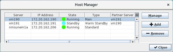 Selection of a server in the hosts list and clicking on the <Manage> button will start the Remote Admin Tool for the selected server. Double-clicking on a row in the hosts list will close the Host Manager and enter the respective host in the “host field” of the NEM Login Window.