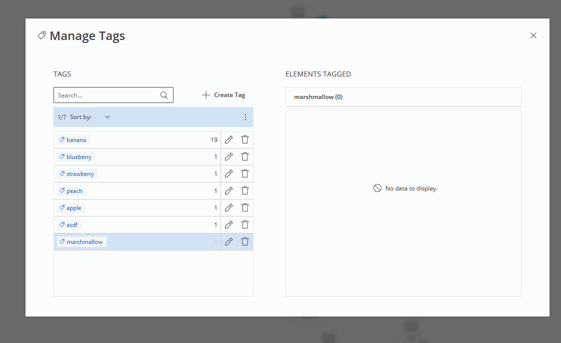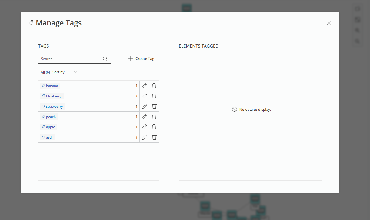 It causes a modal with two side views to be opened. On the left side, a table with all the tags in the system, along with the count of tagged objects is displayed.