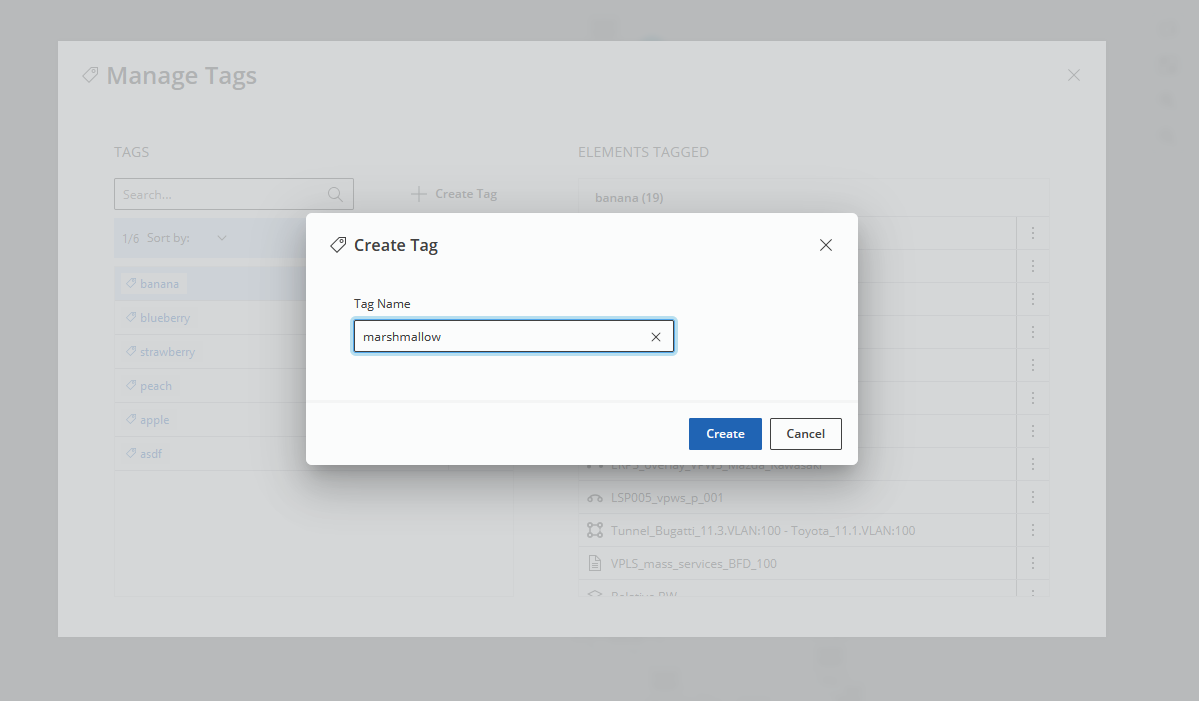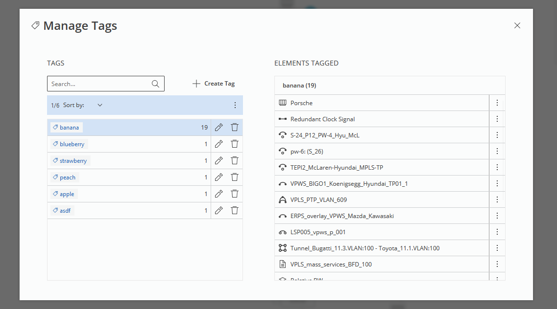 One tag can be attached to objects of arbitrary type. For instance, nothing prevents the tag “banana” from being attached to some NE, VPWS, Tunnel, and DCN OSPF Area.