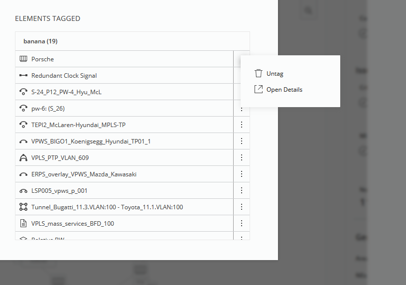 Here, the user has the options to remove the entity from the tag or open its details view.