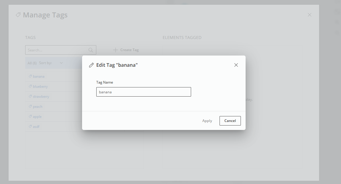 Additionally, the user has an option to create a new tag by clicking the “+ Create Tag” button on the left. This causes a simple dialog with a single input field to be shown: