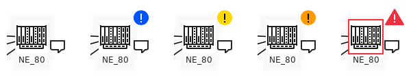 Additionally three flags show a «Polling stopped» situation, a «NE unmanageable» situation and the highest severity of all unacknowledged alarms. With the new map style, the flags have a slightly different graphical design; e.g. the highest severity of all unacknowledged alarms is shown with a specific symbol and color. The figure below shows examples of NE alarm flags for the severities “None”, “Warning”, “Minor”, “Major”, and “Critical”.