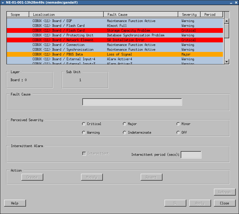 The default settings for fault cause text, severity and intermittent alarm blocking can also be modified individually for each alarm on a unit and subunit level. The customization dialog is called from the hardware views (FOX51x network elements only; FOXMAN-UN client for Windows® only).