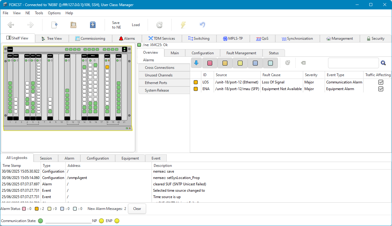 The screenshot below shows an example of the FOXCST GUI connected to a FOX61x NE. The NE is shown in the shelf view, with a presentation of the physical arrangement of the units in the subrack.