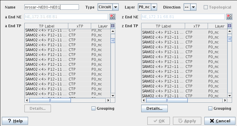In the example below the data service provisioned is based on the «Type» of «Circuit» and uses a bandwidth of a P0_nc «Layer» structure with the application being bi-directional indicated in the «Direction» field.