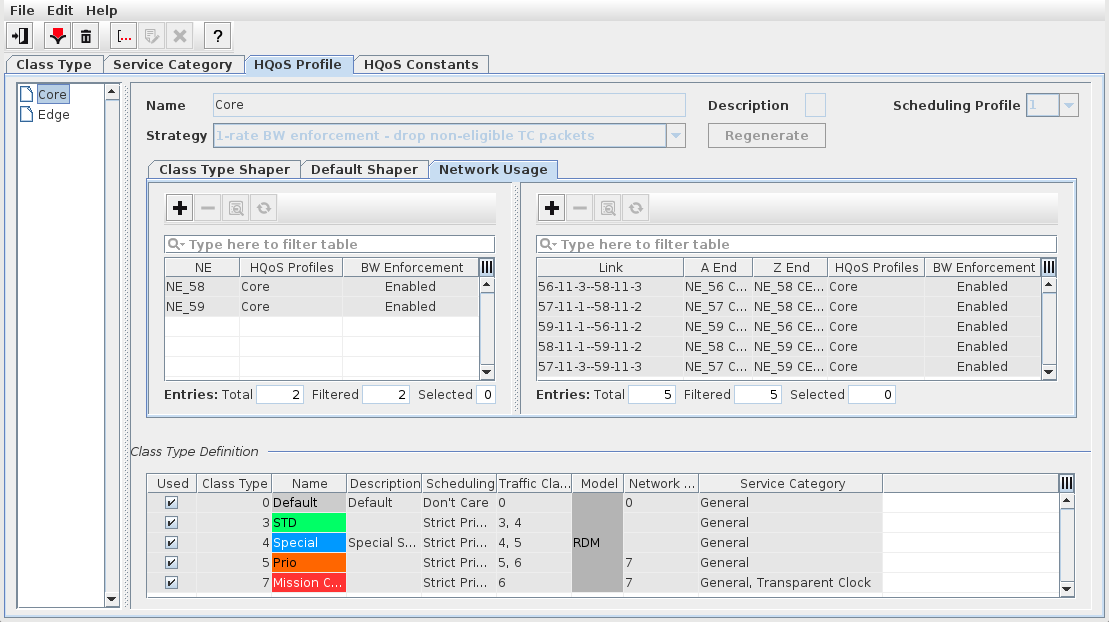 • HQoS Profile definition and allocation of Class Type Shapers to links and/or nodes of the complete network or to parts of it,