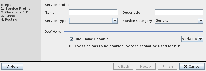 • Service Profile main characteristics, including the selection of the service type (VPLS, VPWS) and of the PE Dual Home option,