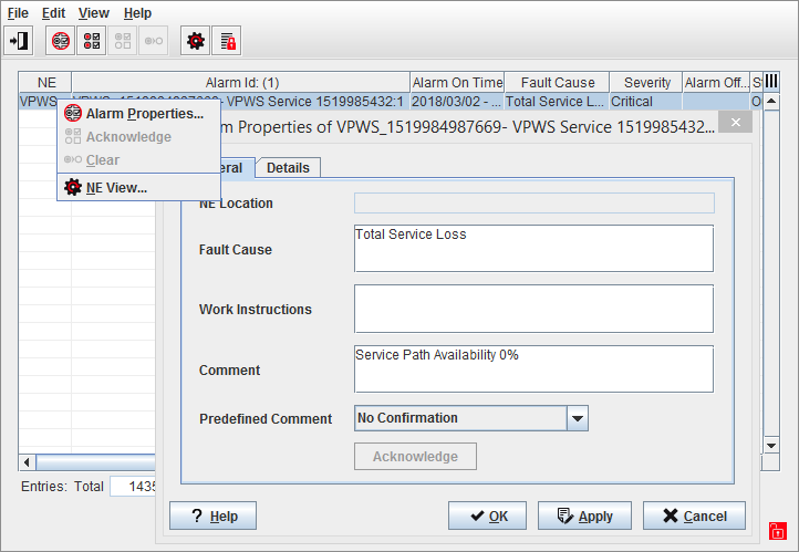 The Alarm List dialog filters the alarms based on the selected element(s), e.g. list only the Service Alarm of the selected service(s) or list all the alarms of the service(s), service path(s) and service components.