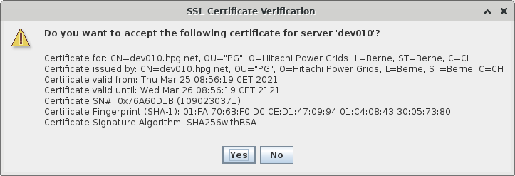 If a user logs in to the specified host for the first time, they will be prompted an “SSL Certificate Verification” dialog upon pressing the <Login> button which looks as the following sample dialog: