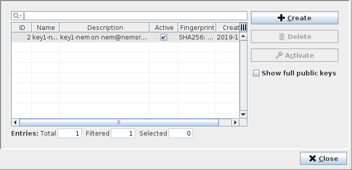 The tool to manage authentication keys is provided in the “Manage Authentication Keys” dialog. It allows you to create, activate, and delete authentication keys. Such keys are used e.g. for secure access to FOX61x nodes.
