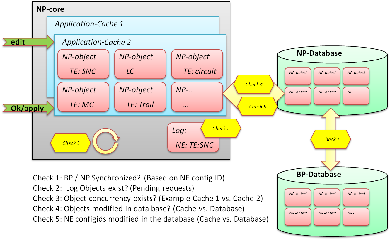 The unsaved object changes (e.g. cross-connection creation) in the network element is discovered by BP and updates the BP database. The BP notifies the NP process and updates the NP database. The loaded objects in User 1 Application Cache, however, are not updated.