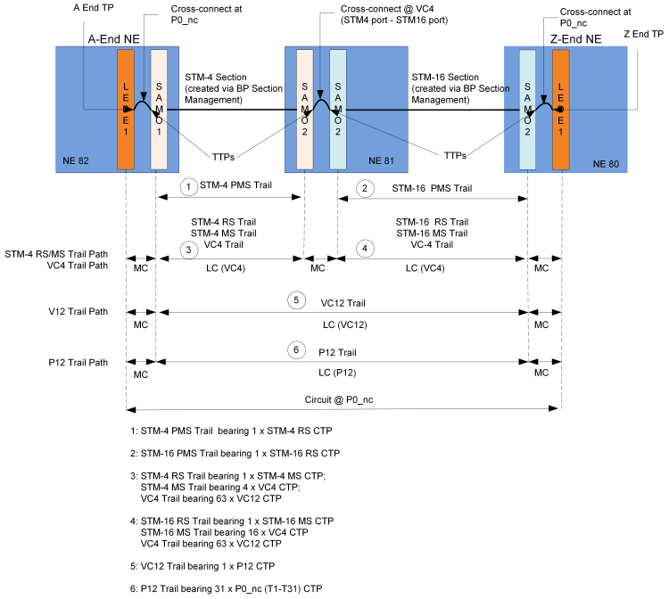 − LC Link Connection between NE 81 and NE 80 on VC4 layer,