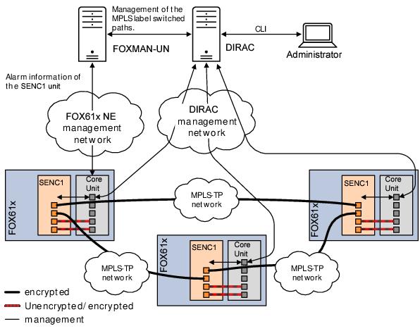 The DIRAC server also forwards the MPLS tunnels crypto configuration information from the FOXMAN-UN to all SENC1 Crypto Engines in the DIRAC system via secured channels over Ethernet or MPLS-TP links, depending on the preferred configuration.