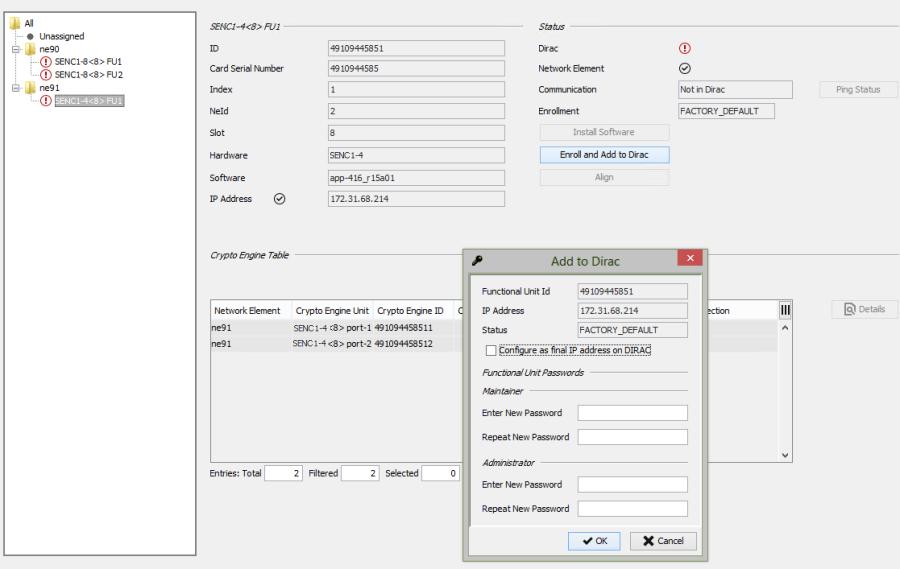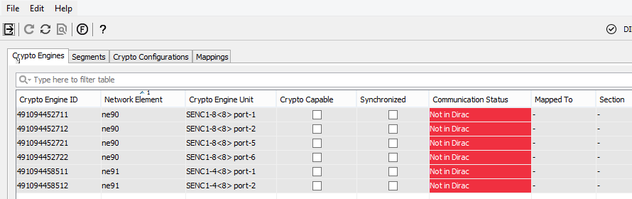 All SENC1 HW units that are assigned will be shown in the ESM. The respective Crypto Engines will appear with a communication status “Not in Dirac” as long as they have not been defined in DIRAC.