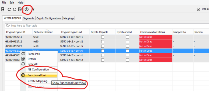 This procedure can be started from the “Functional Unit View” (FU View) dialog window. The FU View can be invoked via icon bar (Icon with an “F”) or from the context menu (Functional Unit) on a Crypto Engine entry in the Crypto Engines table.