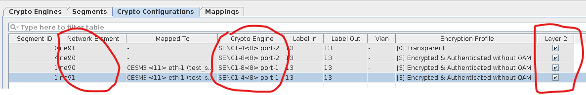 • Segment tab: If you sort rows based on the L2 column, you will see all Crypto Segments which are defining the L2 configuration. You can check the required CE by filtering A-End or Z-End points.