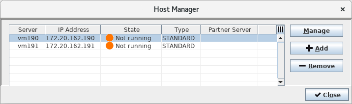 . The Host Manager will open. Next, click on the <+Add> button to display the <Edit Connection> dialog. Add “vm190” to the <Host Name> field. Click into the <IP Address> field. The IP belonging to the host name will automatically be added. Confirm with the <OK> button. Repeat the same steps for “vm191”.
