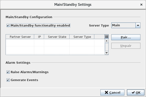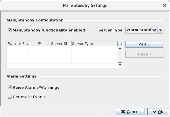 Now open the <Main/Standby Settings> dialog by clicking on the <Main/Standby Configuration…> dialog. Enable the Main/Standby functionality and select Server Type “Warm Standby”. Confirm by clicking on the <OK> button.