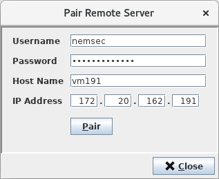 Now everything is prepared for the actual pairing operation. Select the <Pair…> button and on the displayed <Pair Remote Server> dialog enter the NEM security administrator username and password, the hostname, and the IP address of the Standby Server. Then click on the <Pair> button to complete the pairing.