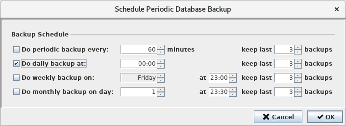 As a next step a periodic database backup must be scheduled. Open the <Schedule Periodic Database Backup> dialog by clicking on the <Schedule Periodic Database Backup…> button. Schedule a periodic backup, e.g. once a day at midnight and confirm by clicking on the <OK> button.