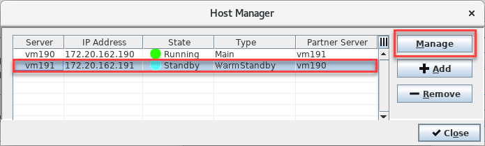The RAT can be started either from the NEM Host Manager or the NEM Desktop. In the NEM Host Manager select the table row containing the server for which the RAT shall be started, and click on the <Manage> button.