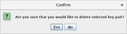 A key pair can be deleted by selecting it in the list of key pairs and then clicking on the <Delete> button on the dialog. A <Confirmation> dialog will be shown where the user must confirm deletion by clicking on the <Yes> button.