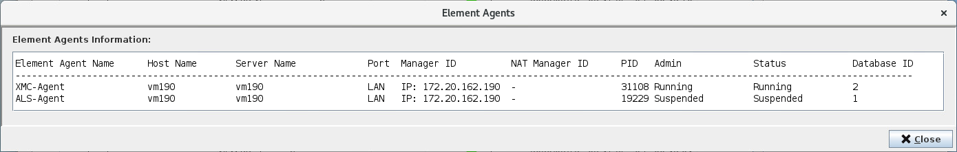 Pressing the <Show Element Agents> button will prompt a window that displays all configured Network Element Agents of the server to which the RAT is connected. For every agent a variety of related attributes such as Element Agent Name, Host Name, Status etc is shown.