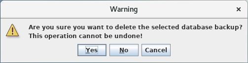 A selected database backup can also be deleted. Clicking on the <Delete Selected Backup> button on the <Restore Database Backup> dialog will delete the backup after clicking on the <Yes> button on the shown warning message.