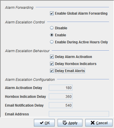 Enable during Active Hours only | Alarm Escalation handling is NOT activated during the time period as specified in the “Inactive Times” entries of the alarming.conf. |