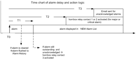 Alarms raised and cleared before T1 time is elapsed will be flushed immediately to Alarm History. Alarms will be logged and displayed into Alarm List only after the T1 time is elapsed.