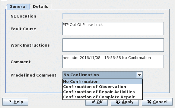Status | Shows “Outstanding” for a currently active alarm or “Cleared” for an inactive, but not yet acknowledged alarm. When a cleared alarm is acknowledged, it is moved to the Alarm History. The history can be accessed from the NEM Desktop. |