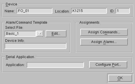 A new template is created in the “Configure Device” dialog by typing a name in the “Select File” combo box. If no templates exist, the combo box is empty, else the template created first is shown. In this case that name has to be marked and overwritten to create a new template. Pressing “Edit” calls the “Edit Alarms/Commands Template” dialog.