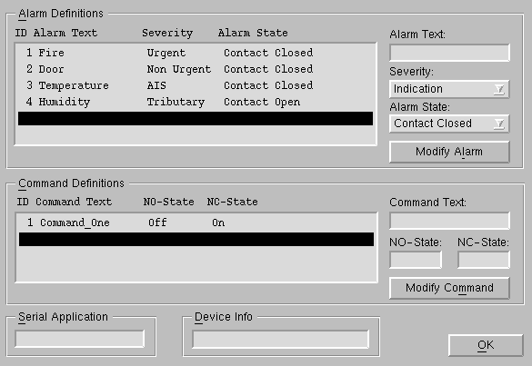 Each ALCAR device has to be assigned to an “Alarm /Command Template”. A template defines a number of alarms with their fault cause text, severity, and input contact polarity as well as a number of commands with name, normally open state text, and normally closed state text. The same template can be assigned to more than one FO.