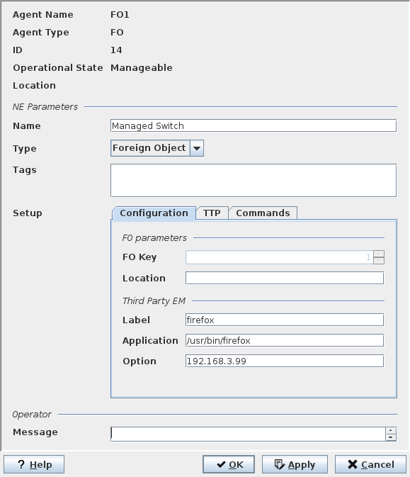 Third Party EM group: | A third party Element Manager associated with the FO can be entered directly in the “Application” field. This application has to be installed previously. The name specified in the “Label” field will appear in the “Activate” item of the FO context menu on a map (see Main Window of the NEM Network Browser). The default label is the name of the application. The specified third party EM can be started directly from the context menu of a FO in a map. The “Option” field allows passing parameters to the application. The following predefined parameters are provided: %N FO name %L FO location %I FO Identity %K FO Key |
