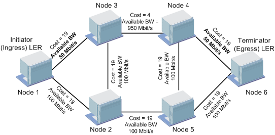 For example, an LSP requires 60 Mbit/s of reserved bandwidth. The routing engine prunes the links whose available link bandwidth are less than 60 Mbit/s