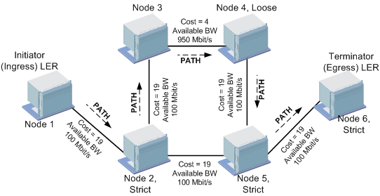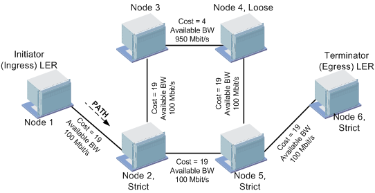 The ERO list of node hops is used as an input to decide the route that the PATH message must travel. The Initiator node calculates the immediate next-hop node of the LSP path by consulting the ERO. It then sends a PATH message to that immediate next hop node (Node 2) using a direct link with lowest cost.
