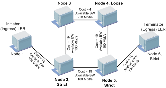 The routing engine uses the Included NE’s ordered lists of nodes as input to form an explicit route. FOXMAN‑UN applies the concept of Explicit Route Order (ERO) based on RFC 3209. Explicit routes are specified as a well-ordered series of node hops. The LSP traverses the nodes in the order that they are specified in the explicit route. The node hops in the explicit route may each be defined by the routing engine as strict or loose. Loose and strict nodes are always interpreted relative to their prior nodes.