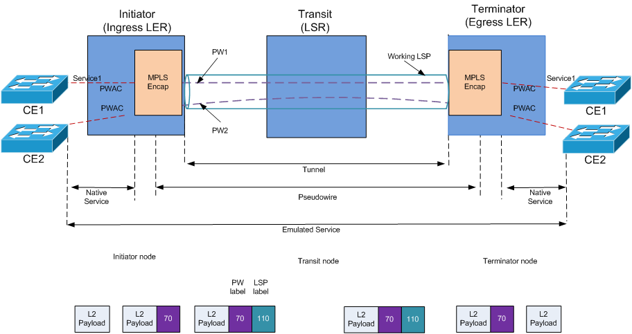 This is the egress LER. Terminator node pops the LSP label and sends the data to the appropriate PWAC based on its PW label. From the sample setup, the egress LER determines the attached PW label as its Local PW1 label. It will then send the packet to PWAC1 and finally to CE1.