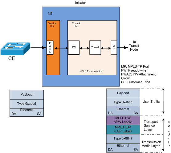 The Initiator performs label push. The remote or destination PW label and the next hop LSP label are added to the packet before sending the labeled packet through an outgoing NNI interface / SNI interface (MPLS-TP port) to the next node (see the illustration above).