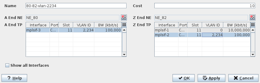 Show all interfaces | | When enabled, all MPLS-TP interfaces of the NE are shown, including those being already used for an existing link. This is for information purposes only. When disabled, only unused interfaces are shown that are available for creation of a new link. |