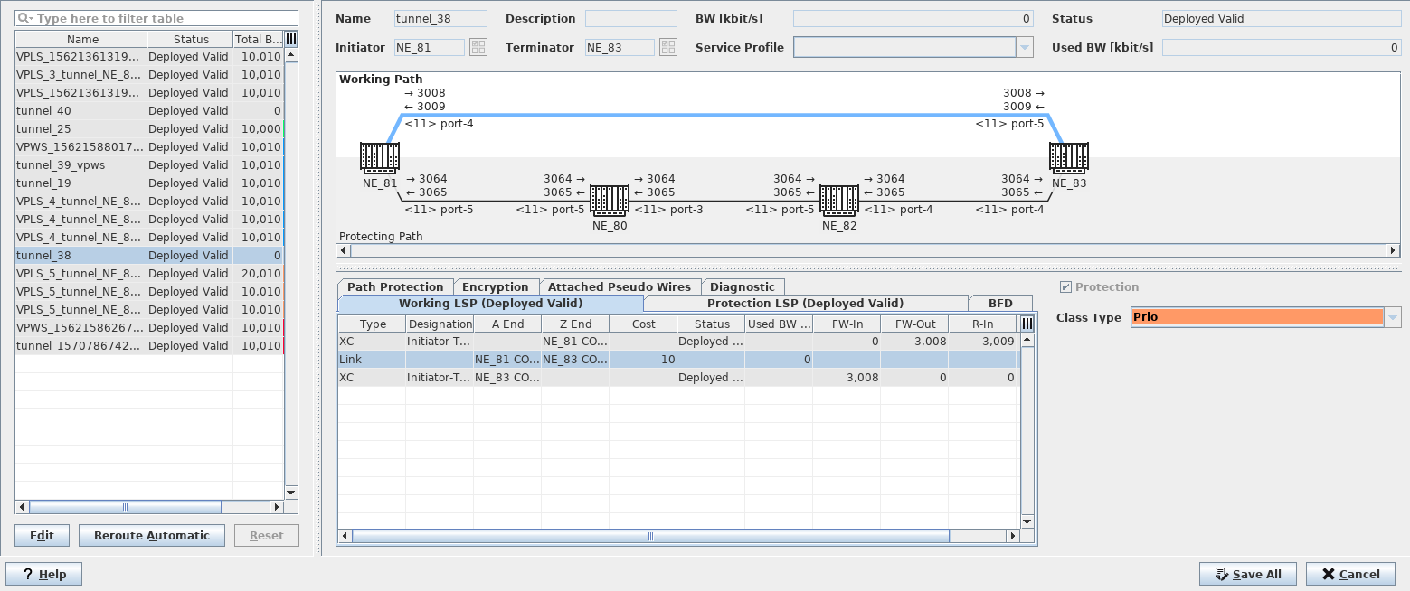 • If you want to manually switch over protected tunnels to the unaffected LSP, select the tunnel from the list, and execute a “Manual Switch” command in the “Path Protection” tab. After this you can close the “Manage Tunnel” dialog.