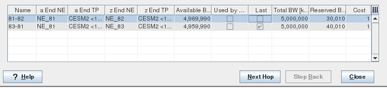 Available BW [kbit/s] | Bandwidth attribute used for the LSP path computation. Available BW = Link BW - Reserved BW Note: All the proposed links’ “Available BW” can satisfy the path’s bandwidth requirement provided the link bandwidth is not set to a value above its physical capabilities. |