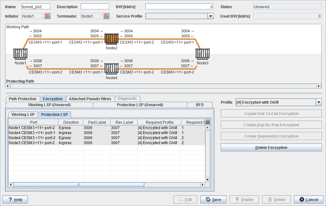 Profile | Select the tunnel encryption profile (applicable to working and protection LSP in case of Protection): - None: No profile applied; this is the default, - [1] Discard: Discard all traffic, - [3] Encrypted & Authenticated without OAM: Encrypt and authenticate all traffic; do not use OAM, - [5] Encrypted & Authenticated with OAM: Encrypt and authenticate all traffic; use OAM. |