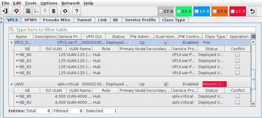 Conflict | A mark in the checkbox is set if there is a conflict occurring on the VPLS on this NE instance. Possible conflicts are inappropriate QoS settings or an inappropriate port VLAN mode. |