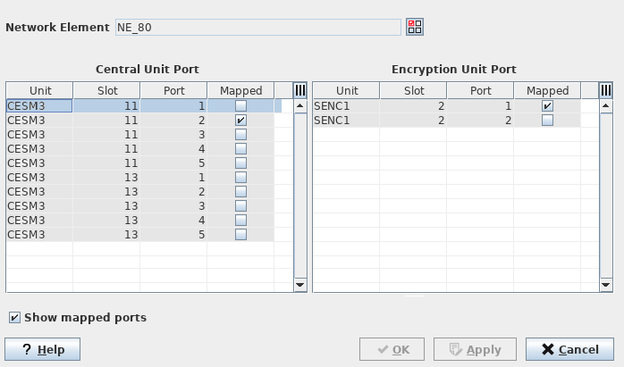 Supports you in defining mappings between ports of the core unit (“Central Unit”) and ports of the encryption unit for a specific Network Element. The dialog is called from the