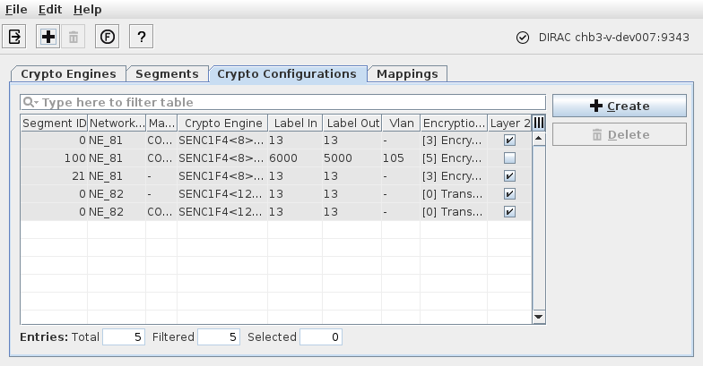 Create… | ![]() | Creates a new Crypto Configuration. For this purpose you need to: - select an existing Crypto Engine, - enter a Segment ID, - enter a Label In, - enter a Label Out, - enter a VLAN ID (if applicable), and - select an Encryption Profile. The following Encryption Profiles are available: - [1] Discard: Discard all traffic, - [3] Encrypted & Authenticated without OAM: Encrypt and authenticate all traffic; do not use OAM, - [5] Encrypted & Authenticated with OAM: Encrypt and authenticate all traffic; use OAM. |
