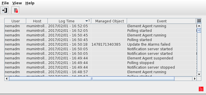 The list is dynamically updated. Events being logged are creation and deletion of agents, creation and deletion of NEs, configuration uploads and downloads for NEs, start/stop of agent, start/stop of individual polling, alarm flooding, forced polling, task creations, etc.