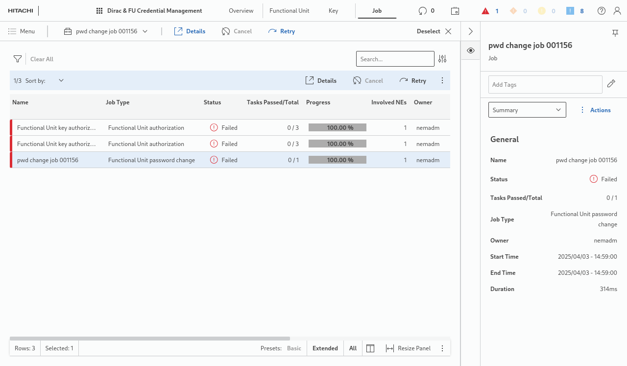 The Details page called for a selected task shows more information available about the job, its tasks and sub-tasks, and the related NE(s).