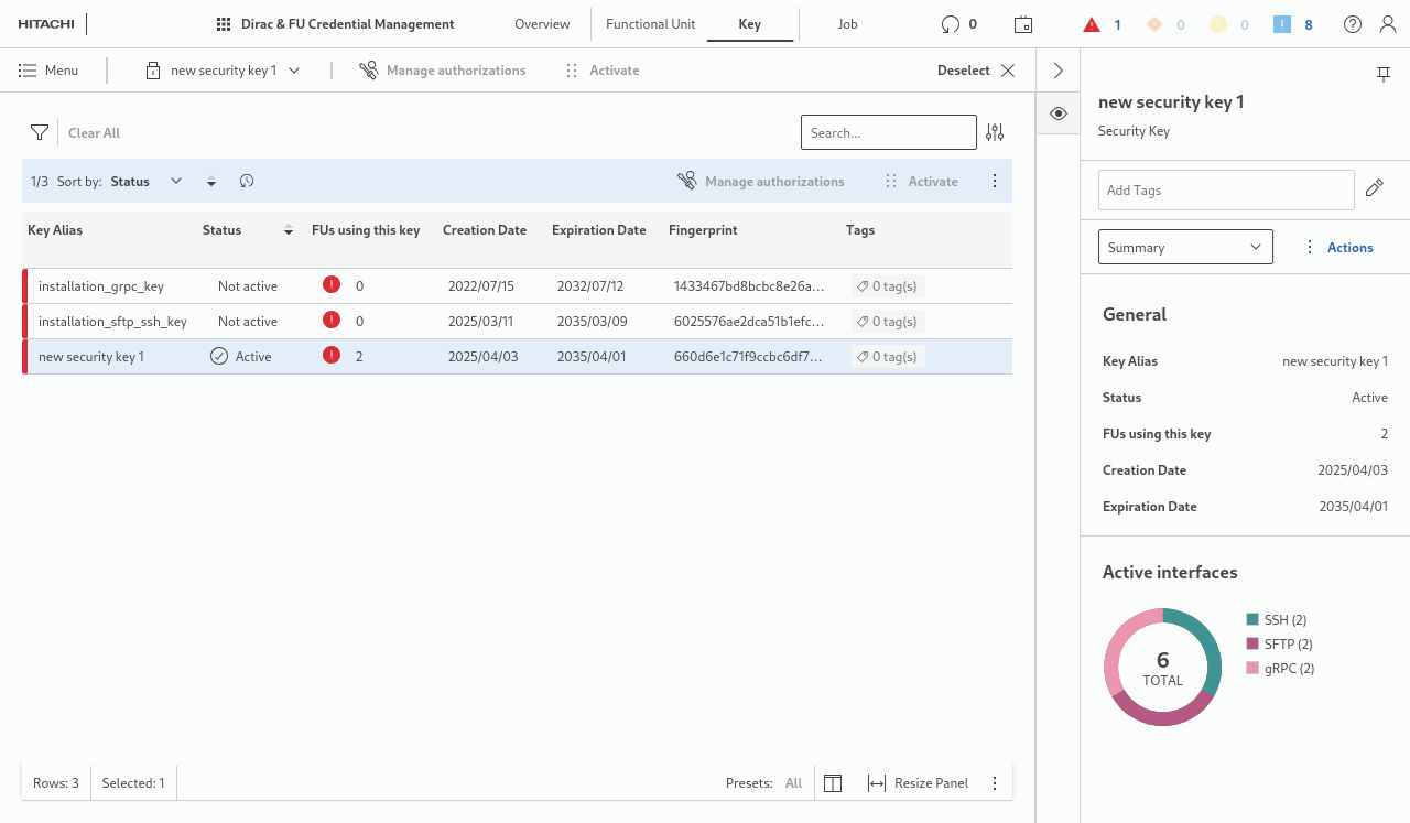When a key is selected from the table, some detailed information is shown in the details panel.